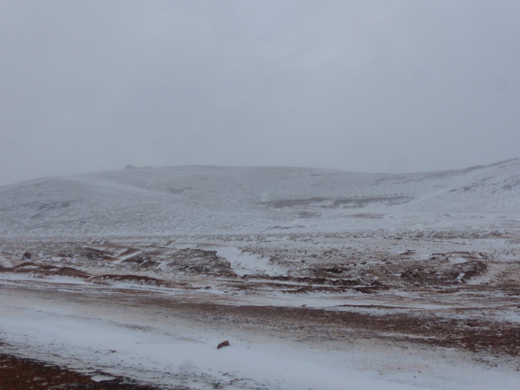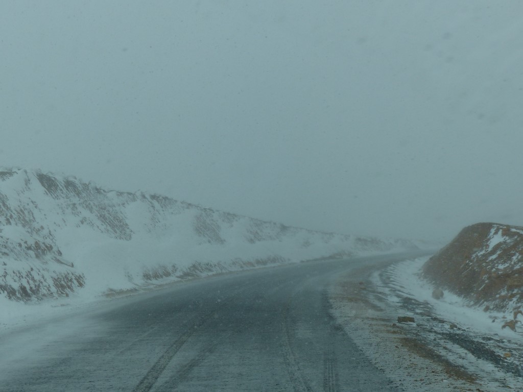 Nous prenons la route du col. Il neigeote un peu, sans que ça ne tienne sur la route. Nous montons toujours. Un peu avant le col, la visibilité devient parfois aléatoire avec des bourrasques de vent et de neige et surtout la route devient blanche. Arrivé au col, la piste démarre et la voie devient étroite. En voyant la terre coller aux roues de la voiture que nous avons rattrapée, nous comprenons que la descente risque d'être très sportive. Pas de risque, nous faisons demi-tour pendant qu'il est encore temps.
