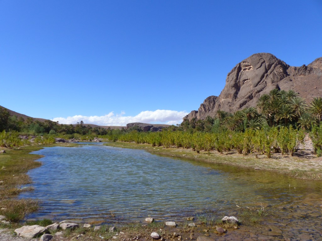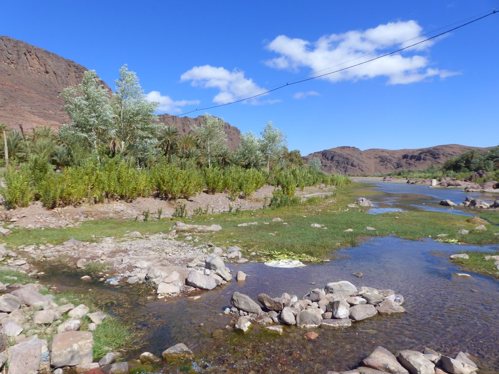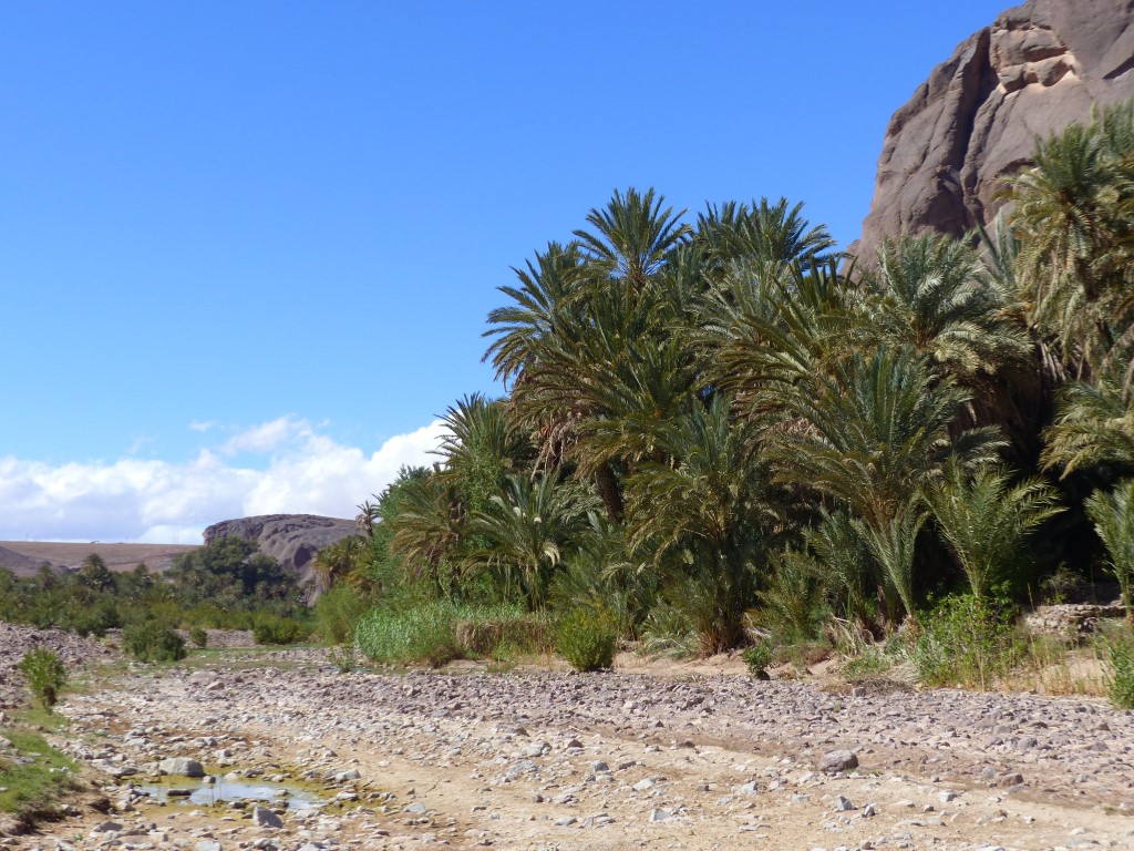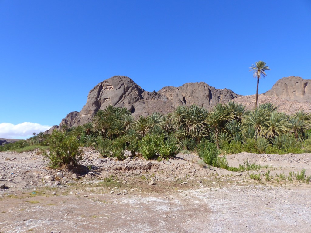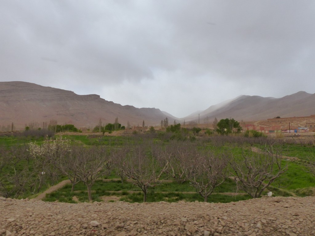 Après cette visite, nous nous rendons dans l’oasis de Fint. Une oasis est un lieu où la végétation a poussée spontanément, contrairement à une palmeraie où la main de l’homme est intervenue. Un comité d’accueil oblige à laisser quelques dirhams, à notre bon vouloir, sans reçu en échange. Nous pique niquons sous des eucalyptus qui nous protègent du soleil et du vent. Il fait très chaud à l’abri du vent et « tout juste » dès que nous sommes au vent. Nous nous baladons le long de l’oasis. Il est très étroit. Nous faisons demi-tour lorsque qu’une personne s’improvise guide et nous colle de trop près. L’endroit est beau mais nous sommes de nouveau des portes monnaies sur pattes. Tant pis. D’ailleurs, il se fait temps de reprendre la route pour un long trajet vers Taliouline. Sur la route, le ciel bleu laisse la place à un temps d’abord noir puis pluvieux et très venté. Le beau temps n’a pas encore gagné dans cette partie du Maroc.