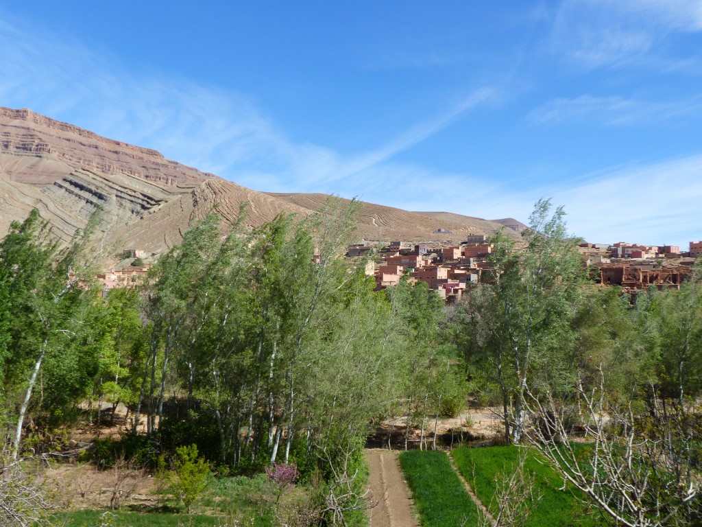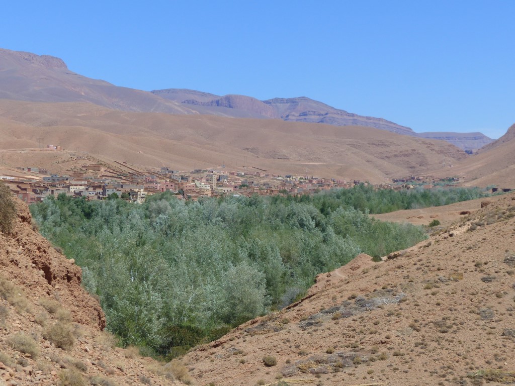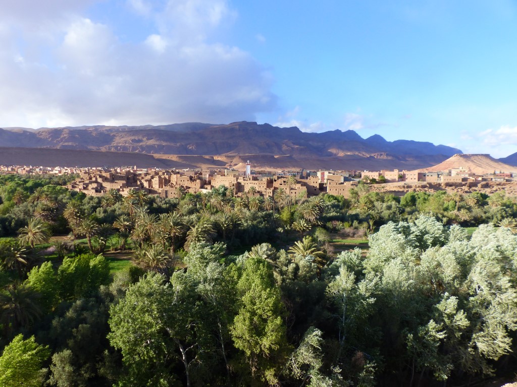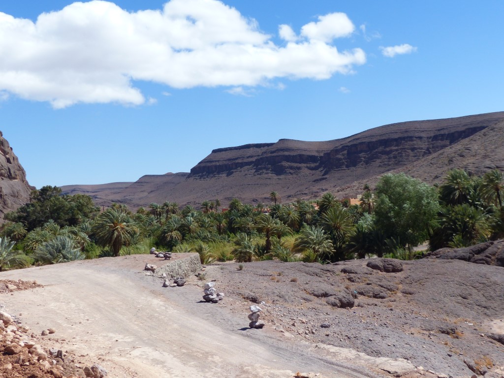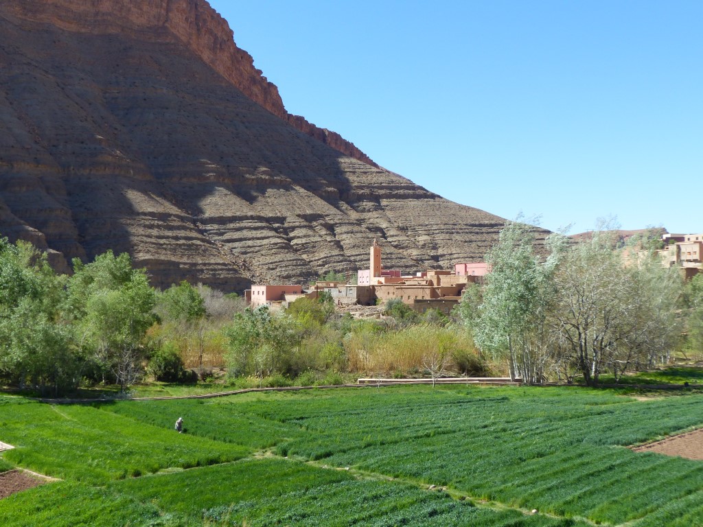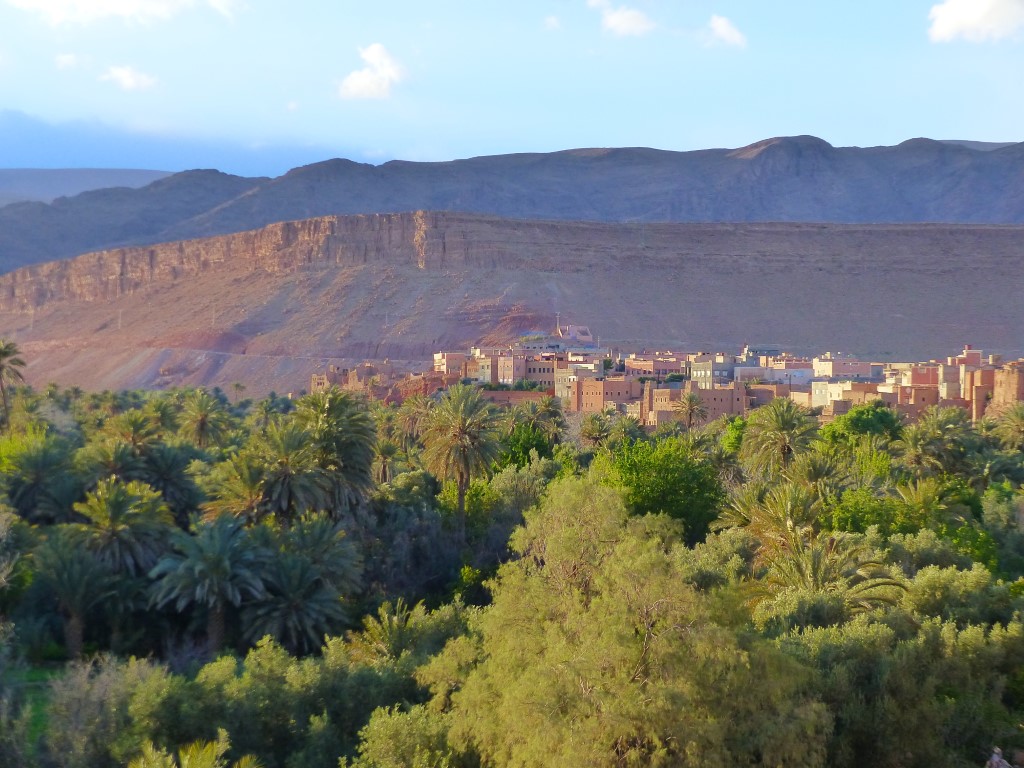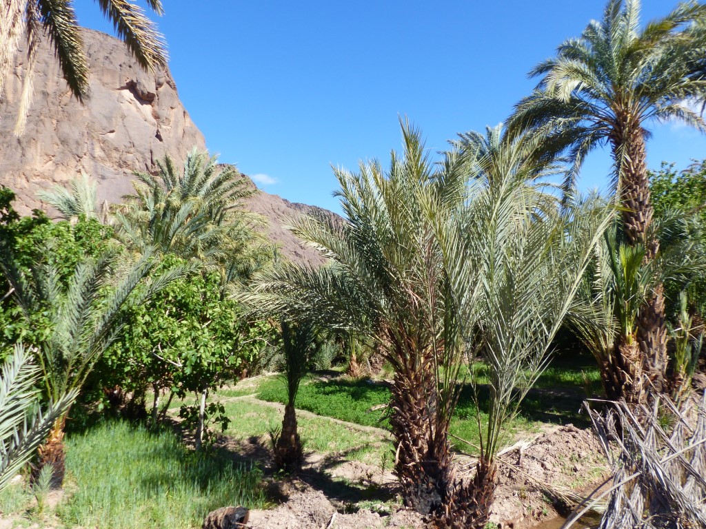 De l'autre côté des gorges, nous atteignons la palmeraie de Tinghir où nous trouvons un hôtel pour la soirée.