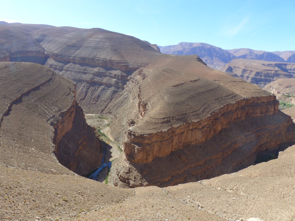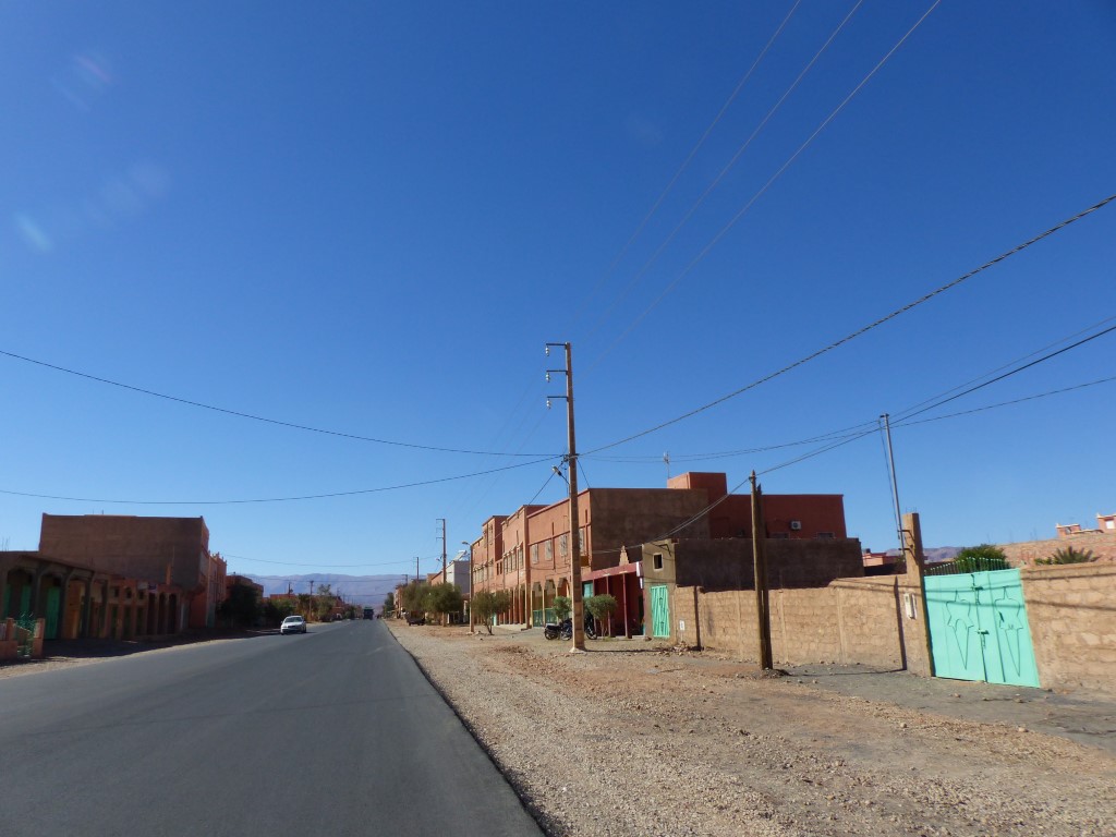 Une fois en voiture, nous prenons la piste indiquée par Amid la veille. D’abord facile, elle se montre un peu plus sélective sur quelques passages sans toutefois nécessiter un 4x4. La piste doit prendre fin à l'issue de 15Km et, effectivement, nous atteignons un village. En l'absence d'indication, à une patte d'oie, nous prenons à gauche en descente. Mauvaise pioche, nous voici à la rivière. Nous remontons et prenons à droite entre les habitations. Google maps n'indique aucune issue et rien ne se précise non plus devant nous. Les habitants sont dans la rue, autours d'un match de foot et les enfants encerclent la voiture. Visiblement, il n'y a pas d'issue à ce village, le tuyau d’Amid se trouve être percé ! Demi-tour pour refaire les 15 km de piste alors qu'il se fait tard. Nous retrouvons la route juste avant que le jour ne décline complètement. De nuit, nous rejoignons Boumalne Dadès et l'hotel "la perle du Dadès", où nous trouvons gite et couvert. C’est un lieu très « classe ».